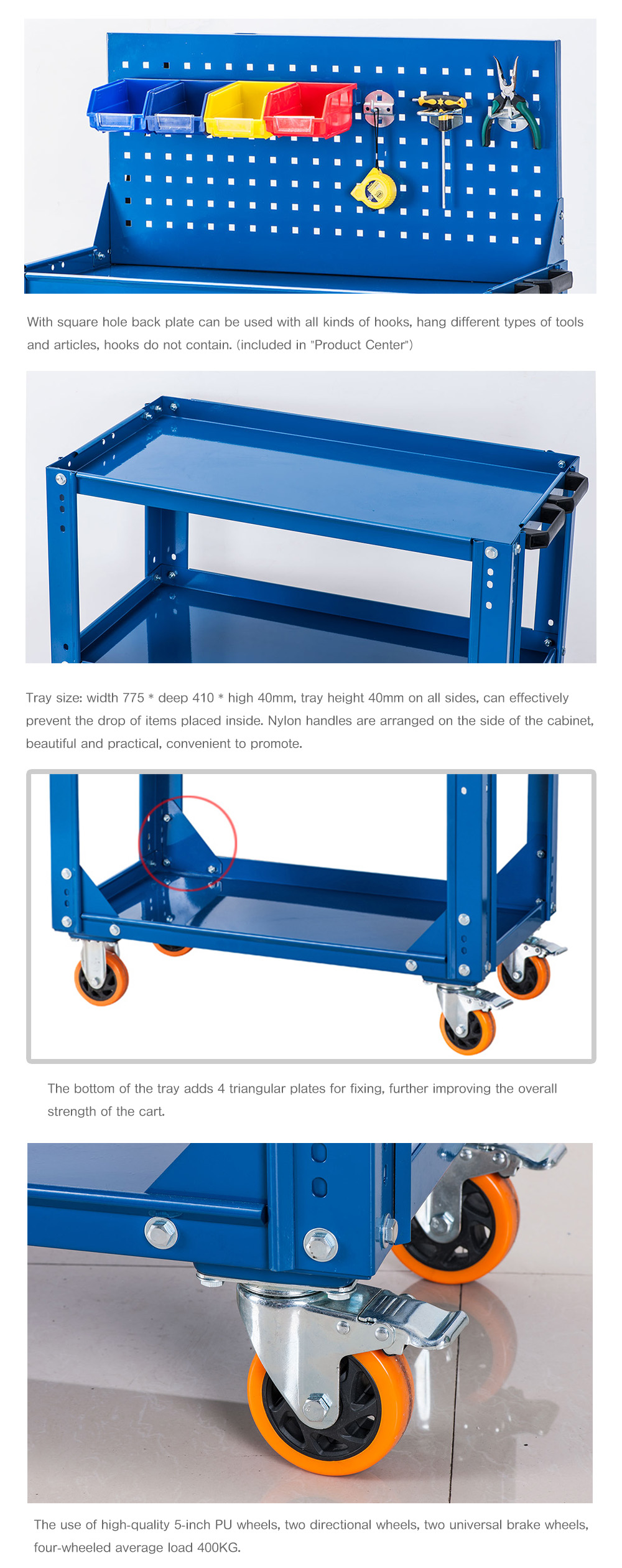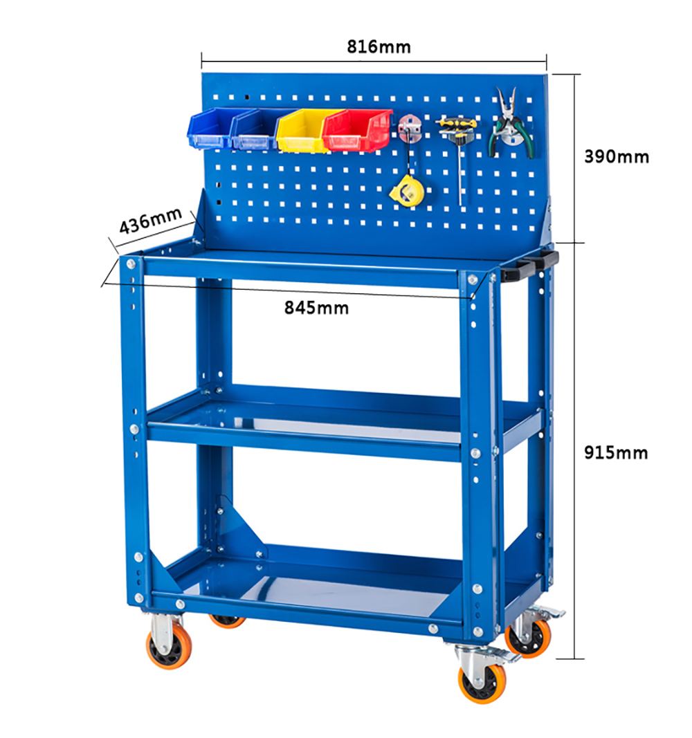 The three-tier cart is suitable for placing various kinds of tools, products, mechanical parts, and also can be used as a cart for product inspection. With a large load, beautiful appearance characteristics.